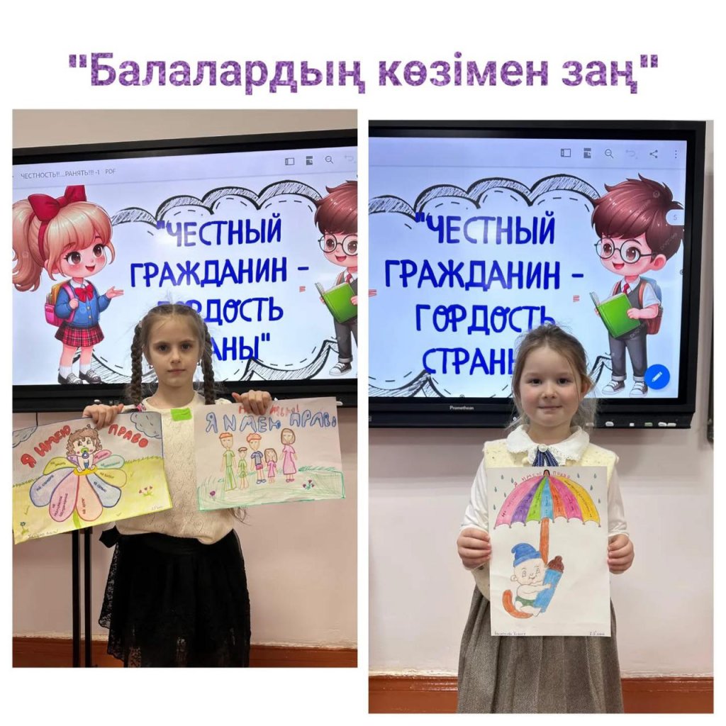 Заң және тәртіп айлығы аясында бастауыш сынып оқушылары арасында «Балалардың көзімен заң» тақырыбында суреттер көрмесі өткізілді.